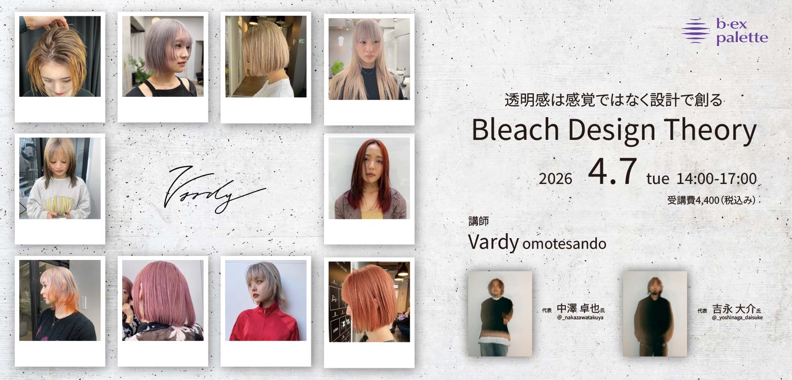【オンライン視聴】透明感、抜け感、品のある柔らかさ。そのすべては、偶然では生まれない。今のサロンワークで求められるブリーチオンカラーは、もはや感覚やセンスに委ねる技術ではありません。カラーの技術の高さから支持されているVardyが導き出した答えは、理論で組み立てるブリーチデザイン。今回のセミナーでは、ケアブリーチのパイオニアとして高い支持を集める中澤卓也氏・吉永大介氏 が、ブリーチ&オンカラーの“再現できる新理論”を公開します。