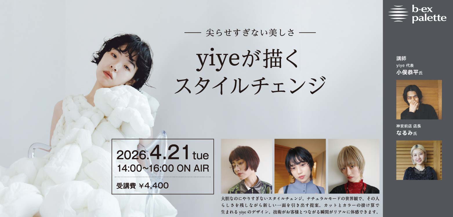 【オンライン視聴】大胆なのにやりすぎないスタイルチェンジ。ナチュラルモードの世界観で、その人らしさを残しながら新しい一面を引き出す提案。カットとカラーの掛け算で生まれるyiyeのデザイン。技術がお客様とつながる瞬間がリアルに体感できます。